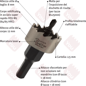 - Attacco sfaccettato per non scivolare nel mandrino (con Ø tazza >18 mm); attacco cilindrico (con Ø tazza <18 mm)