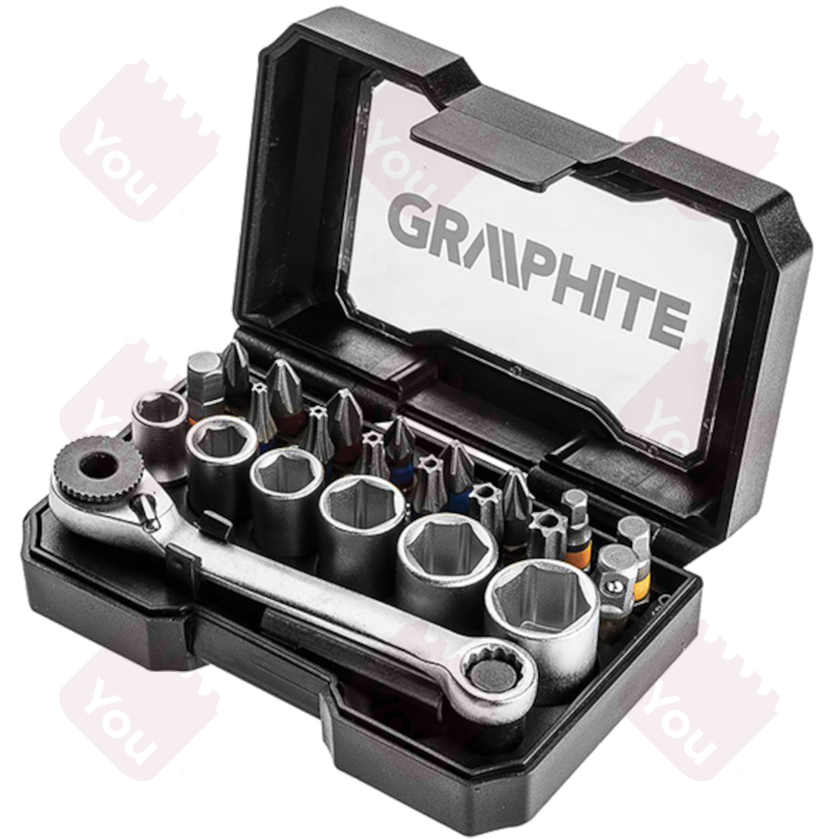 Serie 24 pezzi inserti e bussole: 15 inserti mm 25 SL4/6, PH1/2, PZ1/2, H3/4/5/6, T10/15/20/25/30, 6 bussole 1/4" (mm 6,7,8,10,11,13), portainserti magnetico mm 60, adattatore da 1/4" Hex > 1/4" quadrato, cricchetto bidirezionale 1/4" Hex mm 8, 60T lunghezza mm 95. In acciaio CrV. Box in plastica.