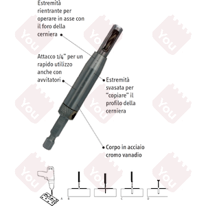 Le punte per cerniere (articolo 52C) consentono di eseguire con estrema praticità e velocità i prefori al centro dei fori delle cerniere anche nei legni più duri, per garantire la massima precisione nel posizionamento e nel montaggio. Le punte possiedono l'estremità rientrante per operare in asse con il foro della cerniera, sono dotate a questo scopo di estremità svasata per copiarne il profilo; le punte hanno codolo ¼" per essere utilizzate con qualsiasi avvitatore in commercio.