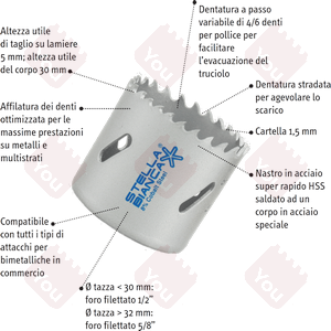 Le seghe a tazza Bimetalliche HSS M42 Cobalto 8%(articolo 75h) sono dotate di una corona in acciaio super rapido M42 con aggiunta di Cobalto e dentatura a passo variabile, accoppiata ad un corpo di acciaio speciale. Questa tecnologia costruttiva consente loro di resistere facilmente al calore ed all'effetto abrasivo generati dall'alta velocità anche su acciaio inox e acciai alto legati.