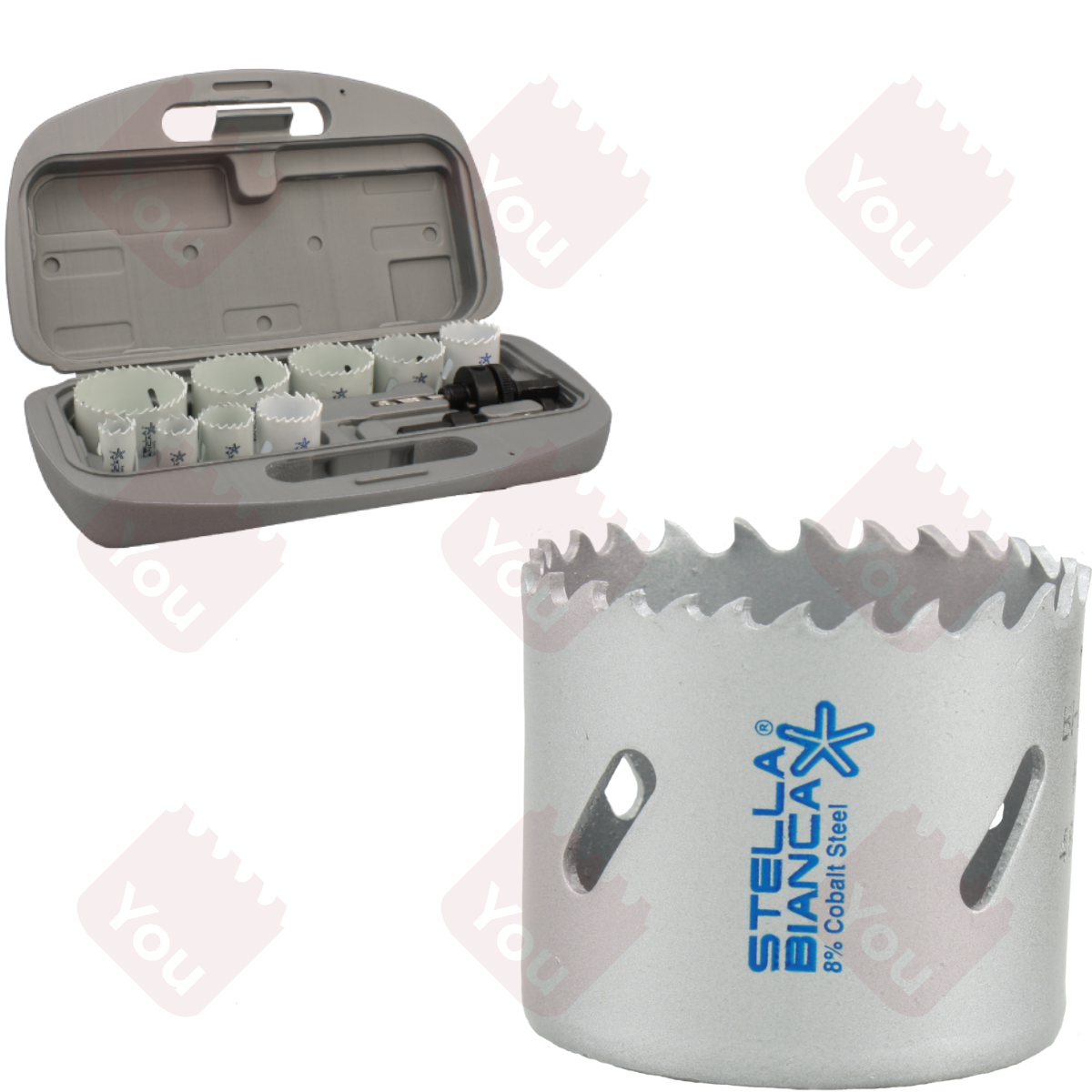 Le seghe a tazza bimetalliche Stella Bianca sono compatibili con tutti i gambi in commercio per utensili di questo tipo. Sono disponibili attacchi con e senza trascinatori, alberi lunghi e Quick-Change Stella Bianca, che si adattano a tutti i modelli di seghe in commercio, nella sezione "Accessori".
