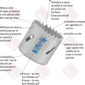 Le seghe a tazza Bimetalliche HSS M42 Cobalto 8%(articolo 75h) sono dotate di una corona in acciaio super rapido M42 con aggiunta di Cobalto e dentatura a passo variabile, accoppiata ad un corpo di acciaio speciale. Questa tecnologia costruttiva consente loro di resistere facilmente al calore ed all'effetto abrasivo generati dall'alta velocità anche su acciaio inox e acciai alto legati.