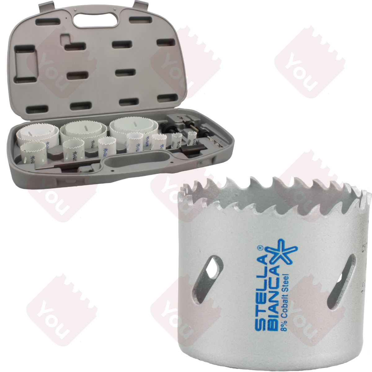 Le seghe a tazza bimetalliche Stella Bianca sono compatibili con tutti i gambi in commercio per utensili di questo tipo. Sono disponibili attacchi con e senza trascinatori, alberi lunghi e Quick-Change Stella Bianca, che si adattano a tutti i modelli di seghe in commercio, nella sezione "Accessori".