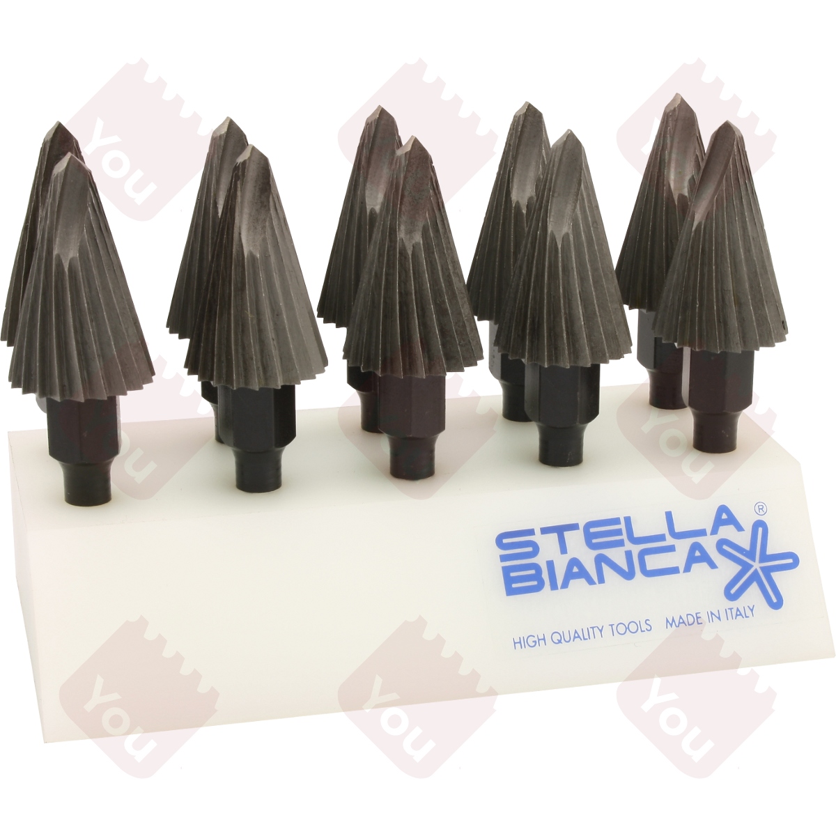 Le frese coniche (articolo 30) sono realizzate partendo da una barra di acciaio HSS M2, tramite lavorazioni meccaniche di tornitura, fresatura ed affilatura. Consentono di effettuare fori di dimensione variabile nel metallo con un solo utensile, sia partendo da un foro già presente che effettuandolo al momento. La scanalatura laterale consente di forare agevolmente lamierini.È disponibile anche la linea di frese coniche Chromium Steel, particolarmente indicata per l'impiego sui materiali meno duri. Se vengono utilizzate con un lubrificante adeguato, le frese coniche hanno lunga durata.Le frese coniche Stella Bianca sono disponibili anche nella versione TiN. Le frese coniche TiN sono dotate di un rivestimento al Nitruro di Titanio che migliora la tenacia dell'utensile e ne agevola lo scivolamento. Questa caratteristica ne fa la scelta ottimale per la lavorazione di metalli più tenaci.Le frese coniche Stella Bianca possono essere montate su ogni trapano a mano e stazionario esistente in commercio.