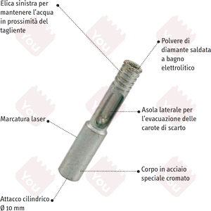 Le vostre esperienze. Riportando le esperienze raccontate dai clienti, la soluzione più utilizzata è il tentativo di foratura con punte da muro standard. Nella quasi totalità dei casi le punte da muro fondono dopo pochi secondi diventando inutilizzabili. Raramente portano alla rottura della piastrella se ben fissata, non riescono nemmeno a scalfire la superficie. Chi possiede trapani avanzati, in cui può settare un numero di giri basso, ci ha riportato di aver provato a utilizzare punte al cobalto. E' sicuramente una scelta migliore e più resistente alle altissime temperature che sviluppa l'attrito della punta con la superficie del gres porcellanato.Tralasciando il fatto che il cobalto si utilizzi nella meccanica per i metalli più tenaci e per l'acciaio inox, dunque ha un'applicazione completamente diversa, accertatevi di avere comunque una buona punta e di utilizzarla sempre a umido. Inoltre armatevi di pazienza, può essere un lavoro lungo e tutt'altro che silenzioso! Soprattutto perché dovrete fare attenzione, una volta scalfita la superficie, a limitare la pressione sulla piastrella, per evitare rotture che non sono infrequenti.Ulteriore passo è stato quello di alcuni utenti che sono partiti con punte a 3 o 4 taglienti con placchette in carburo di tungsteno, utilizzandole a umido o a secco. Avendole a disposizione questa soluzione è quella che sicuramente è più performante, le punte di questo tipo sono però specifiche per il cemento armato e i conglomerati cementizi, forano il gres, ma vanno incontro a un decadimento repentino dell'efficacia di taglio. E' probabile che dopo pochi fori le punte multitagliente perdano completamente l'affilatura o addirittura fondano, con i nuovi gres porcellanti di ultima generazione. Il rischio di rottura, se si procede molto gradualmente, è limitato. Se si tenta subito con diametri grandi è molto elevato.La proposta di YouTools.Clicca qui per vedere i diametri disponibili e i prezzi su YouTools Store!Come potete facilmente dedurre se sono state progettate e prodotte punte apposite per questa lavorazione un motivo c'è.Le punte per gres porcellanato sono studiate per forare anche la classe 5 di durezza di questo materiale. Presentano elica sinistra per mantenere l'acqua in prossimità della punta con polvere di diamante saldata a bagno elettrolitico. L'asola laterale permette un'agevole evacuazione delle carote di scarto e il corpo in acciaio speciale cromato garantisce un'ottima robustezza del corpo anche dopo sollecitazioni prolungate.Le punte devono essere utilizzate solo a umido e a rotazione: la percussione non solo è sconsigliata, ma estremamente controproducente e aumenta nettamente il rischio di rottura della superficie della piastrella.Per ottenere un risultato perfetto e non compromettere la durata degli utensili avvicinarsi con la punta già in movimento con un'inclinazione di circa 30-45°. Intagliare la piastrella riportandosi dolcemente in posizione ortogonale. Esercitare una LIEVE PRESSIONE: una spinta troppo forte comporterebbe un eccessivo aumento della temperatura ed il distaccamento del diamante. Forando in orizzontale (pavimento) realizzare una piccola pozza d'acqua, forando in verticale (parete) inumidire il tagliente con l'ausilio di una spugnetta bagnata o con l'apposito dispensatore d'acqua.Il video seguente spiega dettagliatamente come effettuare la lavorazione. Seguendo questa procedura le punte per gres che trovate sul sito sono andate oltre i 60 fori consecutivi senza avere decadimenti di efficienza, un risultato veramente eccezionale.
