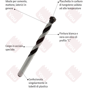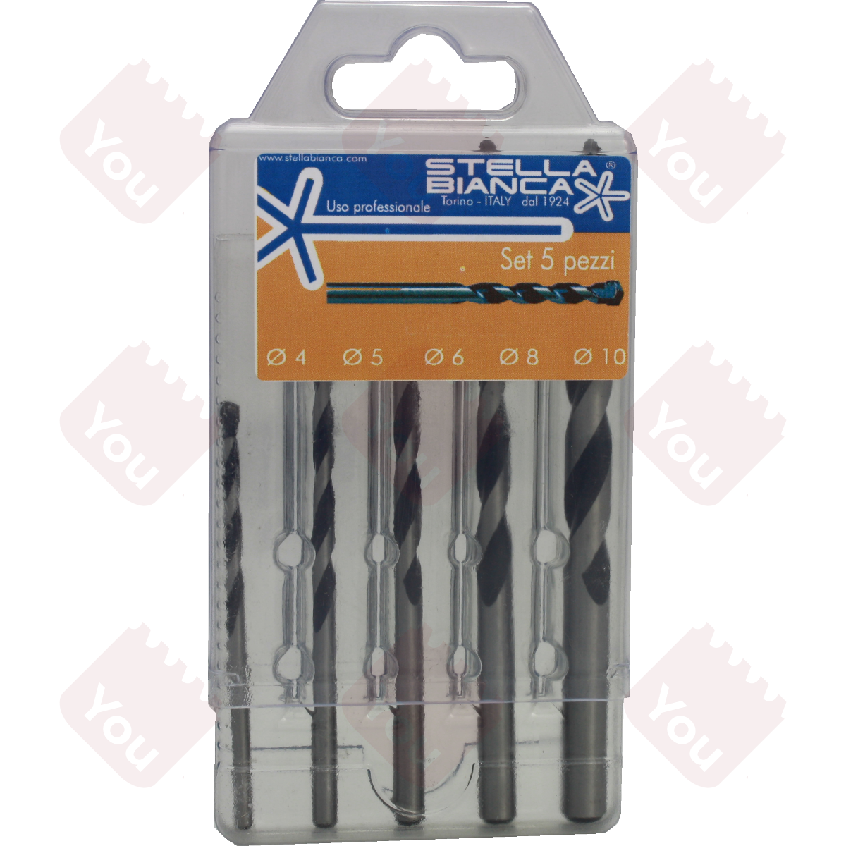 Con placchetta in carburo di tungsteno per forare cemento, mattoni e laterizi in genere, qualità professionale. Inclusi diametri 4, 5, 6, 8, 10 mm, gambo cilindrico