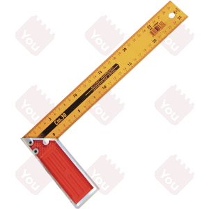 Squadra per falegnami con impugnatura in alluminio verniciato e rettificato su tutti i lati. Lama in acciaio al carbonio C70 verniciato a due colori (rosso e giallo). Scala millimetrata stampata su entrambi i lati della lama