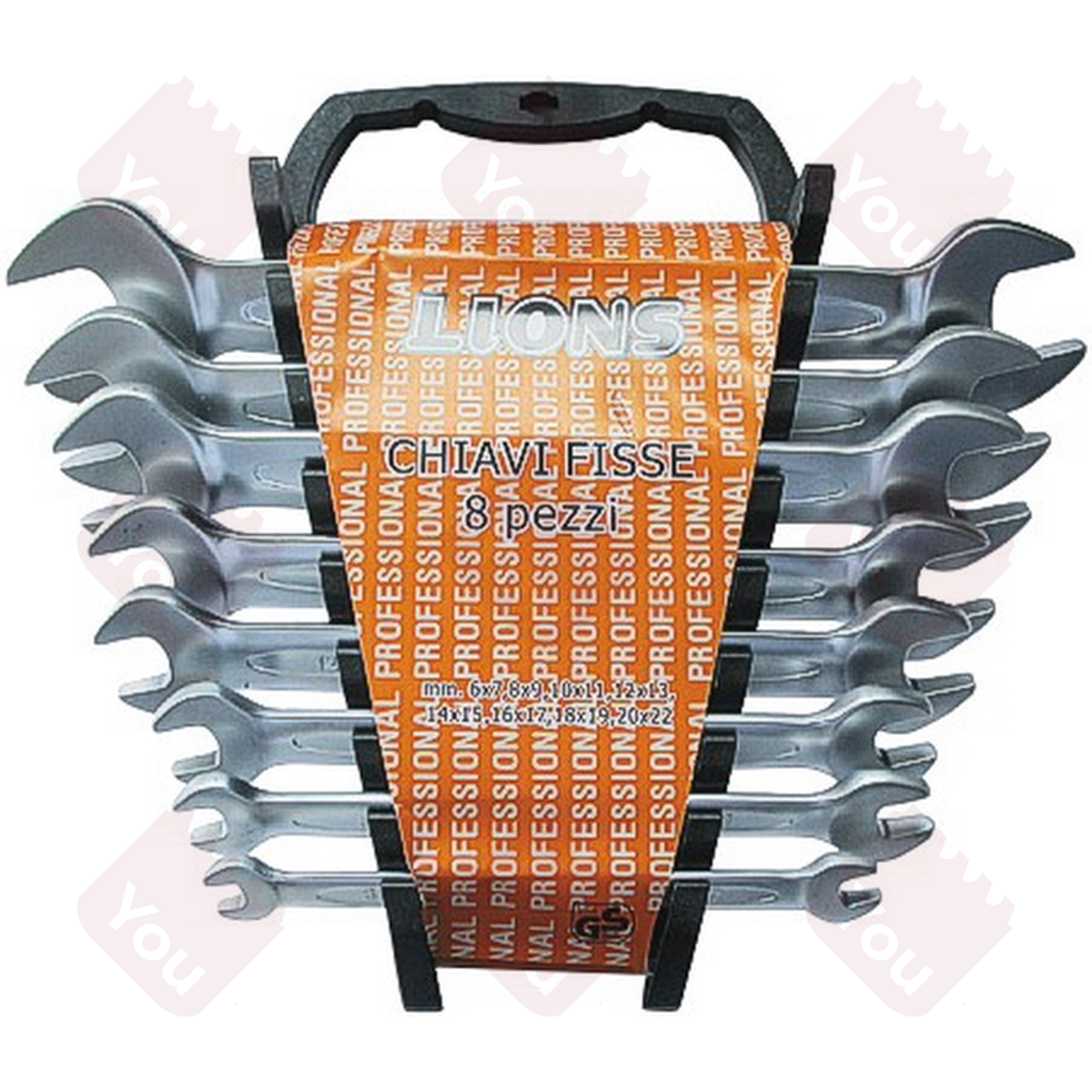 Chiavi fisse in acciaio cromo vanadio. Serie 8 pz: mm 6x7 - 8x9 - 10x11 - 12x13 - 14x15 - 16x17 - 18x19 - 20x22