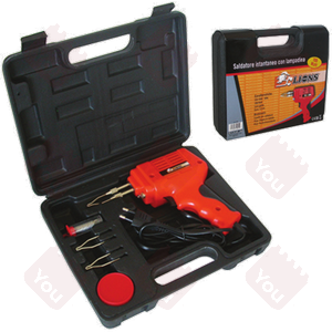 Potenza 100W. Con luce guida. Cavo mt.1,5. In valigetta con accessori: 3 punte per saldatura, 10gr. stagno in tubetto, 10gr. pasta disossidante