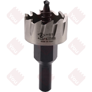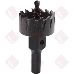 Fresa a tazza HSS completa di gambo e punta guida per la foratura dei metalli.