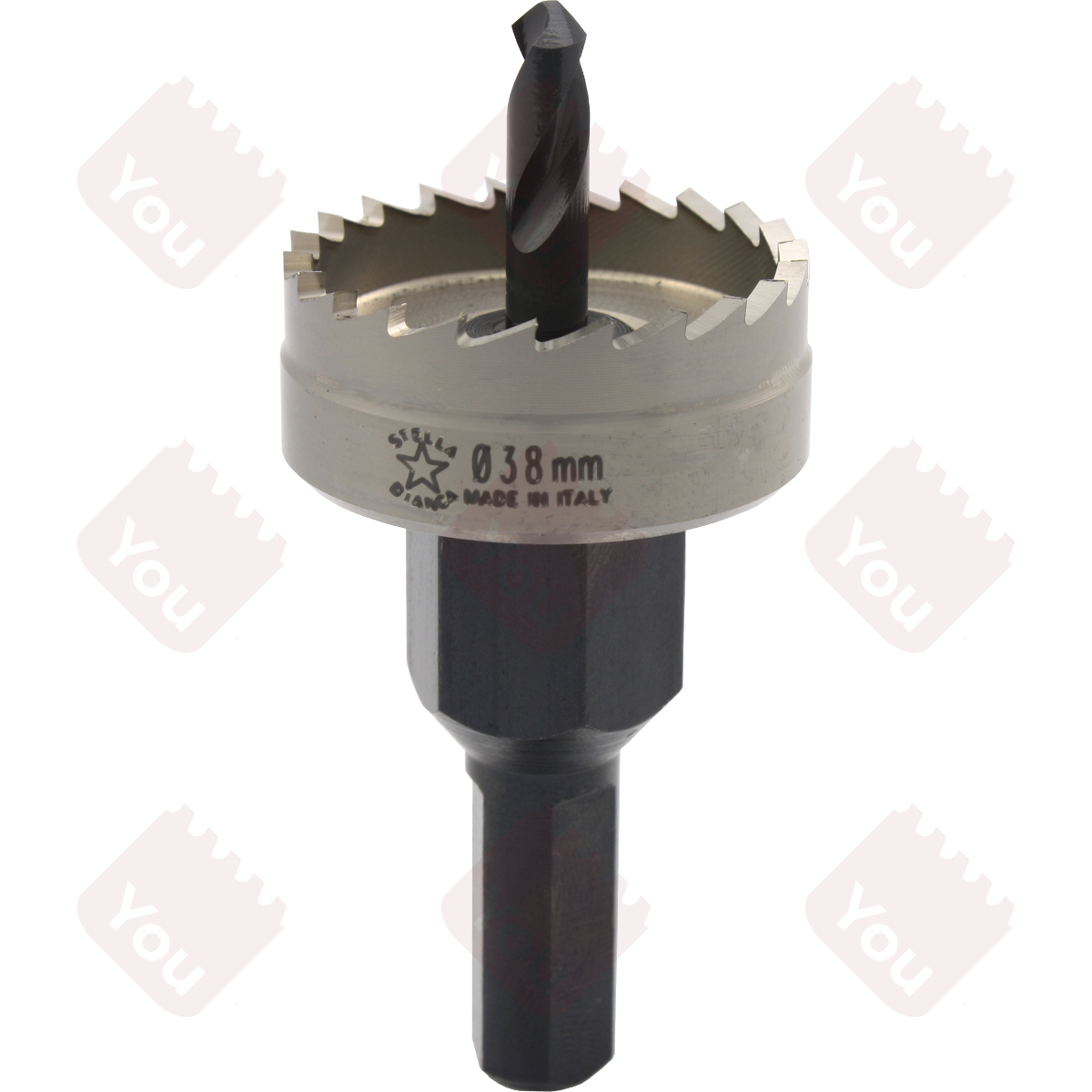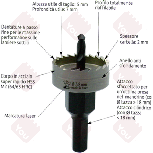 La fresa a tazza HSS export (articolo 37) è realizzata partendo da una barra di acciaio AISI M2, tramite lavorazioni meccaniche di tornitura, rettifica e dentatura. Viene poi sottoposta a trattamento termico in atmosfera controllata; la durezza così ottenuta è di 64/65 HRC. La dentatura è più fitta rispetto alla fresa a tazza HSS standard (articolo 33) ed alla fresa a tazza HSS con scarico laterale (articoli 36, 36T e 36TX). Questa caratteristica la rende particolarmente indicata per eseguire fori di precisione su lamiere metalliche di spessore sottile. Per garantire un impiego ancora più agevole e sicuro è dotata di un anello antisfondamento, situato a fondo tazza. Le proprietà di taglio degli utensili professionali in acciaio super rapido (HSS) si contraddistinguono per l'ottima durata dell'affilatura e le eccezionali resistenza e tenacità in qualsiasi lavorazione; inoltre l'HSS può lavorare a temperature più alte senza perdere le proprietà di taglio. Si differenzia dai cosiddetti "acciai rapidi" per la presenza di cobalto nella lega, che permette tempi di taglio notevolmente inferiori. Le frese a tazza HSS export sono riaffilabili e, se vengono rispettate le prescrizioni circa le velocità di taglio e l'uso di lubrorefrigerante, hanno lunga durata.