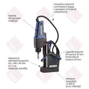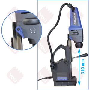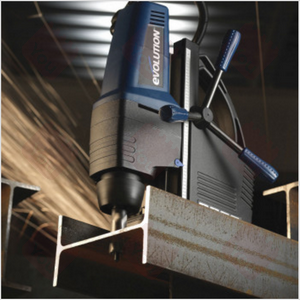 Evolution MAG42 (articolo 148.1742) è un trapano professionale a supporto magnetico specifico per eseguire fori su metalli con frese (max.35 mm), punte elicoidali o utensili specifici (allargafori, svasatori, ecc.). E' un'unità di foratura elettromagnetica potente e leggera, ideale per eseguire lavorazioni in luoghi difficilmente accessibili e impraticabili.
