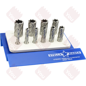 Frese HSS con attacco 19 mm per trapani a supporto magnetico h=50mm, diametri inclusi 12, 14, 16, 18, 20, 22 mm e punta guida