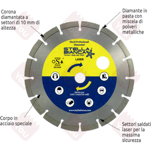 Con corona a settori saldati laser per il taglio universale. Eccellenti prestazioni e rapidità di taglio. Raccomandato per tutti i materiali edili duri, cemento, pietre, conglomerati, ecc.