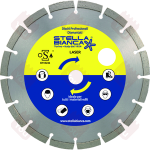 Con corona a settori saldati laser per il taglio universale. Eccellenti prestazioni e rapidità di taglio. Raccomandato per tutti i materiali edili duri, cemento, pietre, conglomerati, ecc.