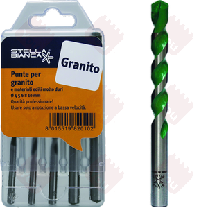 Le punte per Granito (articolo 82G) sono realizzate a partire da una barra di acciaio speciale, con corpo fresato dal pieno e rettificato, su cui viene poi montato, con le migliori tecniche di saldatura, un inserto in Carburo di Tungsteno. Le Punte per Granito sono utensili superprofessionali per la foratura del granito e dei materiali duri. Sono dotate di placchetta in Metallo Duro (Carburo di Tungsteno) di classe K, e presentano affilatura destra con forte scarico, da utilizzarsi a rotazione e a bassa velocità (max. 200 giri/min).