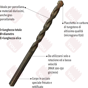 Le punte per porcellana e materiali durissimi (articolo 82P) sono realizzate a partire da una barra di acciaio speciale, con corpo fresato dal pieno e rettificato, su cui viene poi montato, con le migliori tecniche di saldatura, un inserto in Carburo di Tungsteno di altissima qualità (micrograna K20). Le Punte per porcellana sono utensili super professionali per la foratura dei materiali durissimi, compreso il gres porcellanato, da utilizzarsi a rotazione e a bassa velocità (max. 100-150 giri/min).