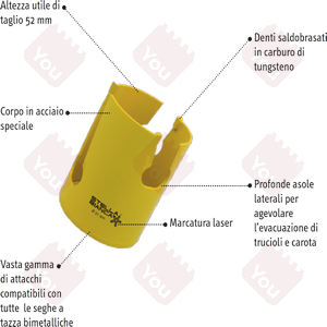 Con denti riportati in metallo duro, articolo specifico per forare legno, plastica, pannelli multimateriali (es. MDF) e mattoni. Inclusi diametri 25, 32, 38, 44, 51, 54, 63, 70, 76, 80, 92, 102, 121 mm