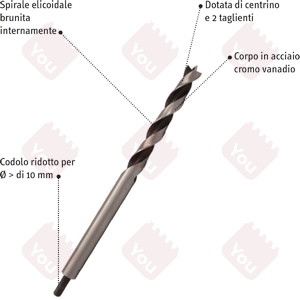 Le punte possiedono un'affilatura performante per lavori precisi e puliti, sono dotate a questo scopo di centrino e doppio tagliente; il corpo è in acciaio cromo vanadio con codolo ridotto per diametri minori di 10 mm.